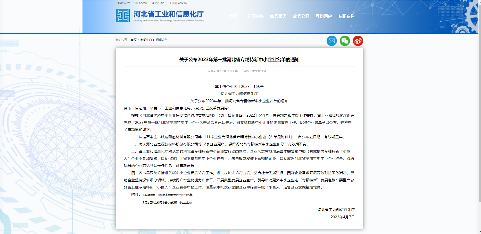 2023年4月7日,河北省工業和信息化廳發布《關于公布2023年第一批河北省專精特新中小企業名單的通知》,河北冀科工程項目管理有限公司被認定為2023年“專精特新”中小企業。